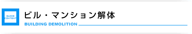 マンション・ビルの解体は、特定建設作業届けを作成・提出したうえで着工します。RC造のマンションやビルなど鉄筋コンクリート建造物の解体は、壁倒し時に最も注意が必要です。内側に重心を保ち、ワイヤーで逆転防止をしながら慎重に作業を行い、粉塵もたくさんでますので、埃が舞い散らないよう水をまきながら工事をすすめます。
